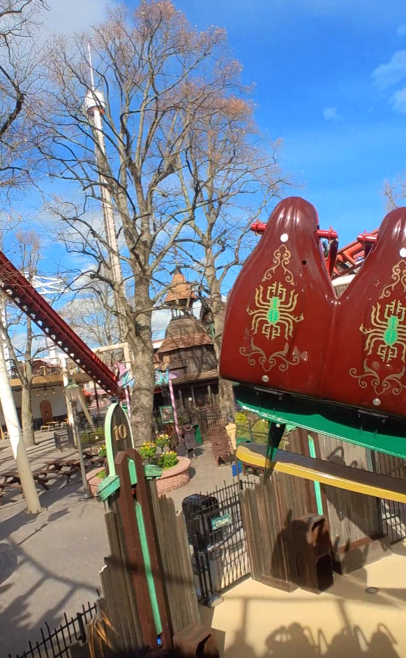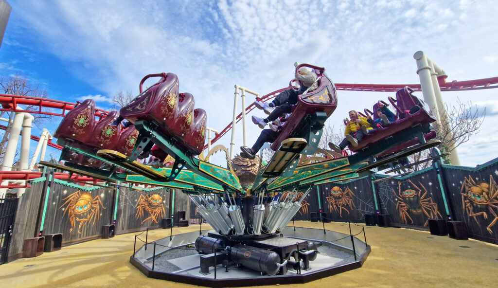 Placeringen är mellan Kvasten och Blå tåget och ”storytellingen” bakom Spindeln är att Häxan tog sig ett husdjur som växte upp till detta busiga och snabba kryp. Snygg och fartfylld attraktion med egen musik!