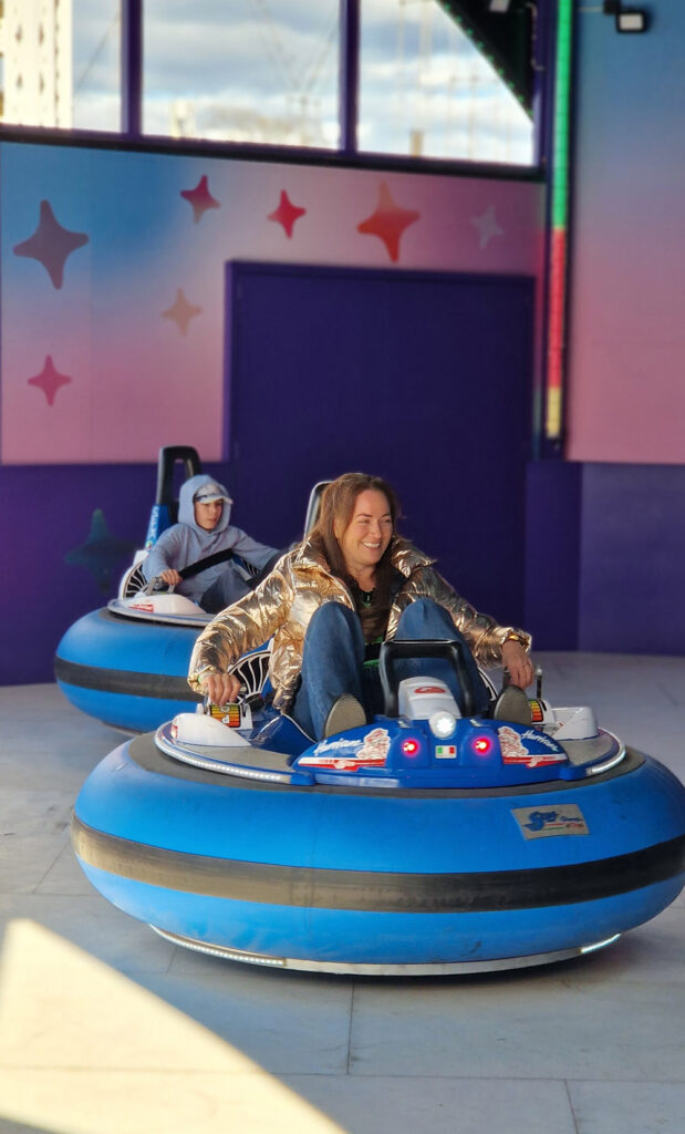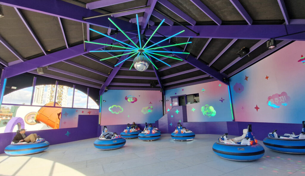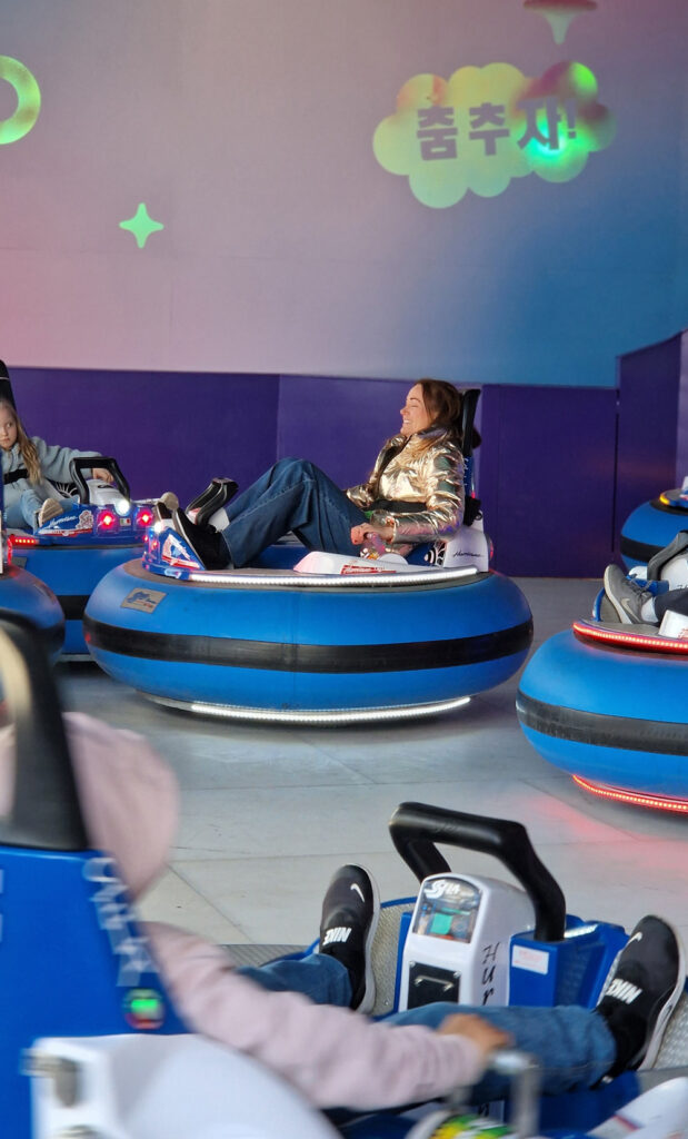 Medan solen sken letade vi oss därefter vidare mot nästa nyhet; K-street med roliga hjul att spela på, nya attraktionen K-pop-bumpers där man krockar runt / studsar mot andra och snurrar (men självstyrt denna gång) till tonerna av K-pop.